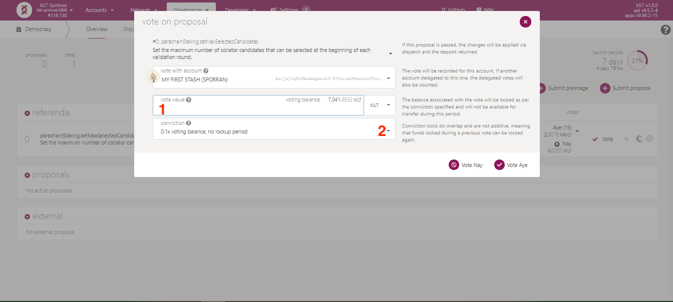This opens a separate pop-up. Enter the amount of coins you want to lock (1). The minimum required to vote is 1 KILT.