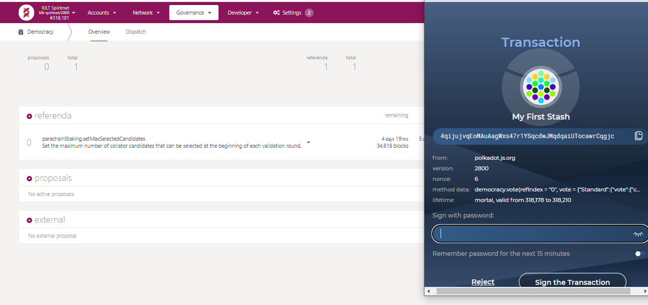 noteif the referendum is successful, your coins will remain locked for this period; if unsuccessful, your tokens will be unlocked when the referendum has finished. Also because voting happens transparently on-chain, it requires a small transaction fee (around 0.017 KILT). Locked tokens or tokens used for staking can be simultaneously used for voting, but a usable, unlocked balance to cover this fee is required.