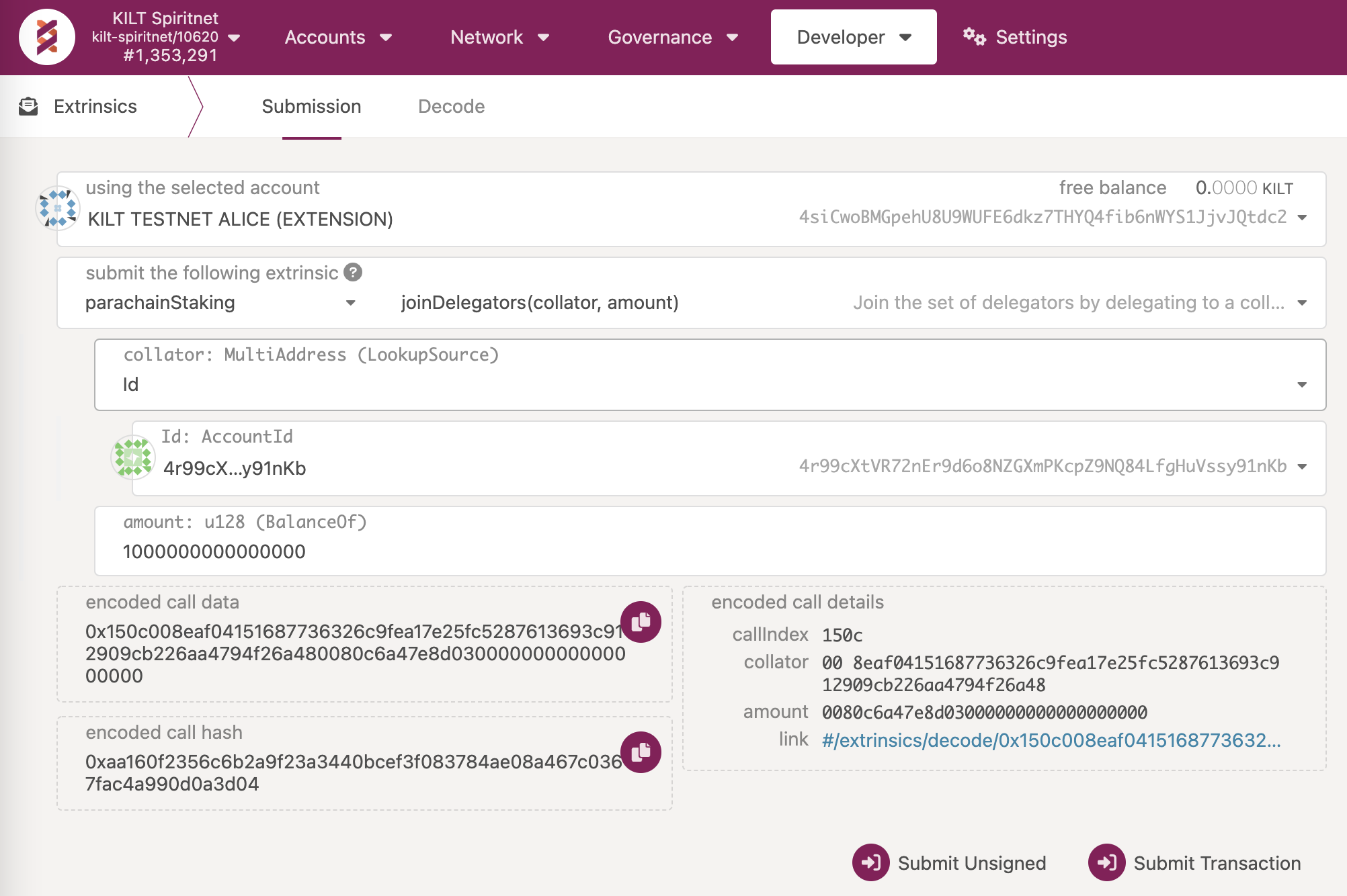 - Select the KILT address you want to delegate from as the extrinsic submitter (the using the selected account field)