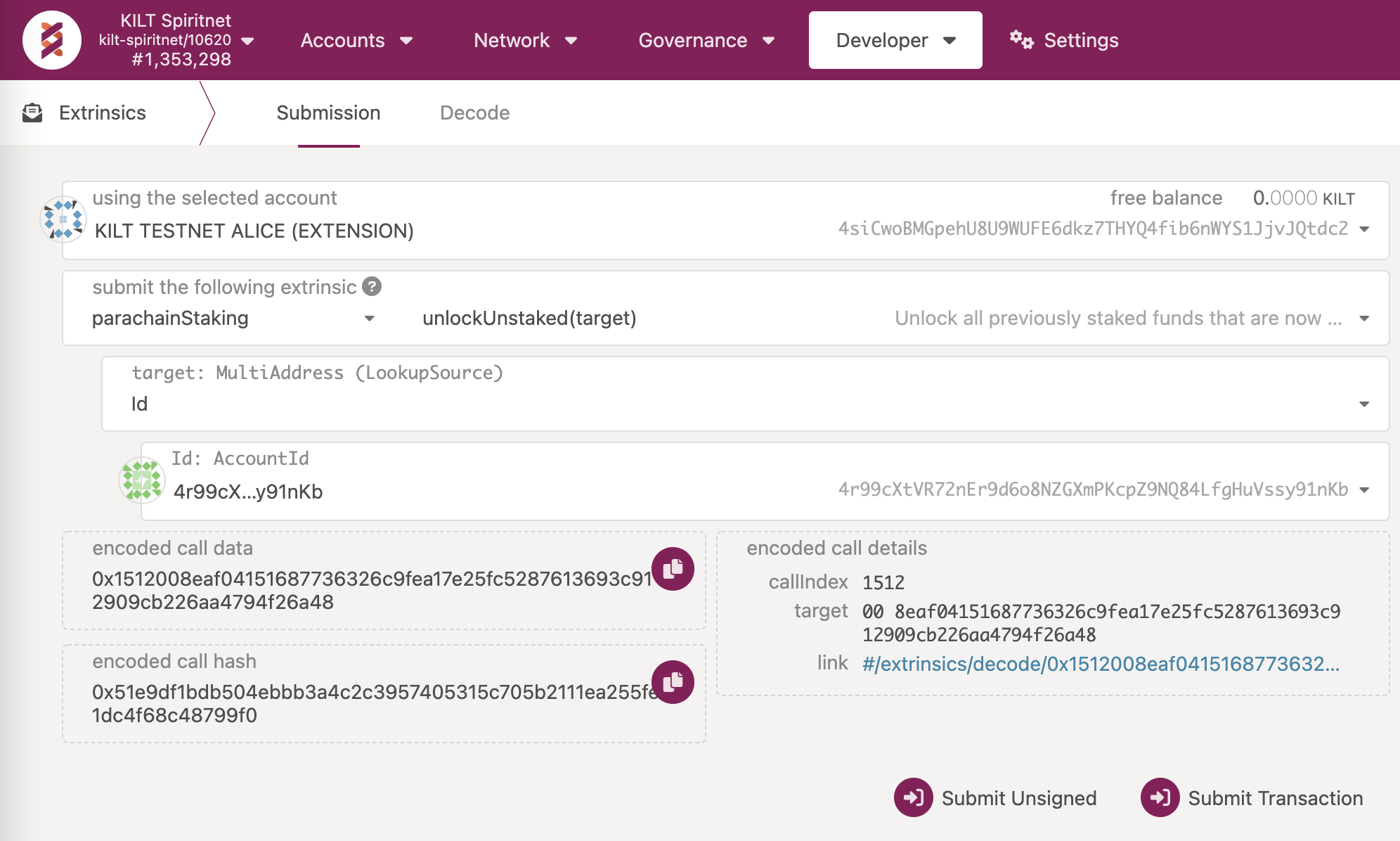 In the Polkadot JS Apps (wss://spiritnet.kilt.io, or wss://peregrine.kilt.io) go to Developer -> Extrinsics -> Submission.